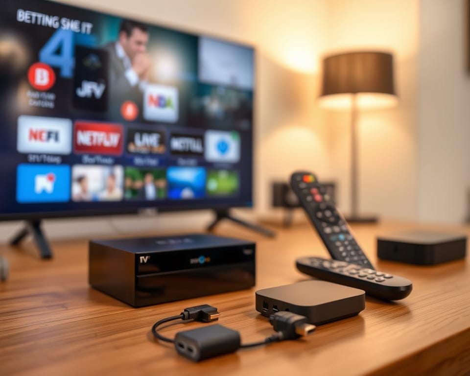 A clean, well-lit table display featuring various compatible devices for the Dev IPTV Pro platform. In the foreground, a modern smart TV, a sleek streaming box, and a compact HDMI dongle, all arranged neatly. In the middle ground, a selection of remote controls and cables, highlighting the interconnectivity between the devices. The background blurs softly, drawing the eye to the featured products. Warm, soft lighting casts a natural glow, creating an inviting and informative atmosphere for the viewer to explore the technical requirements for an optimal Dev IPTV Pro experience.